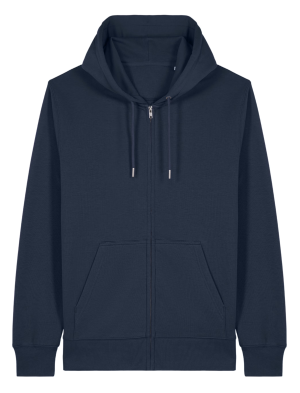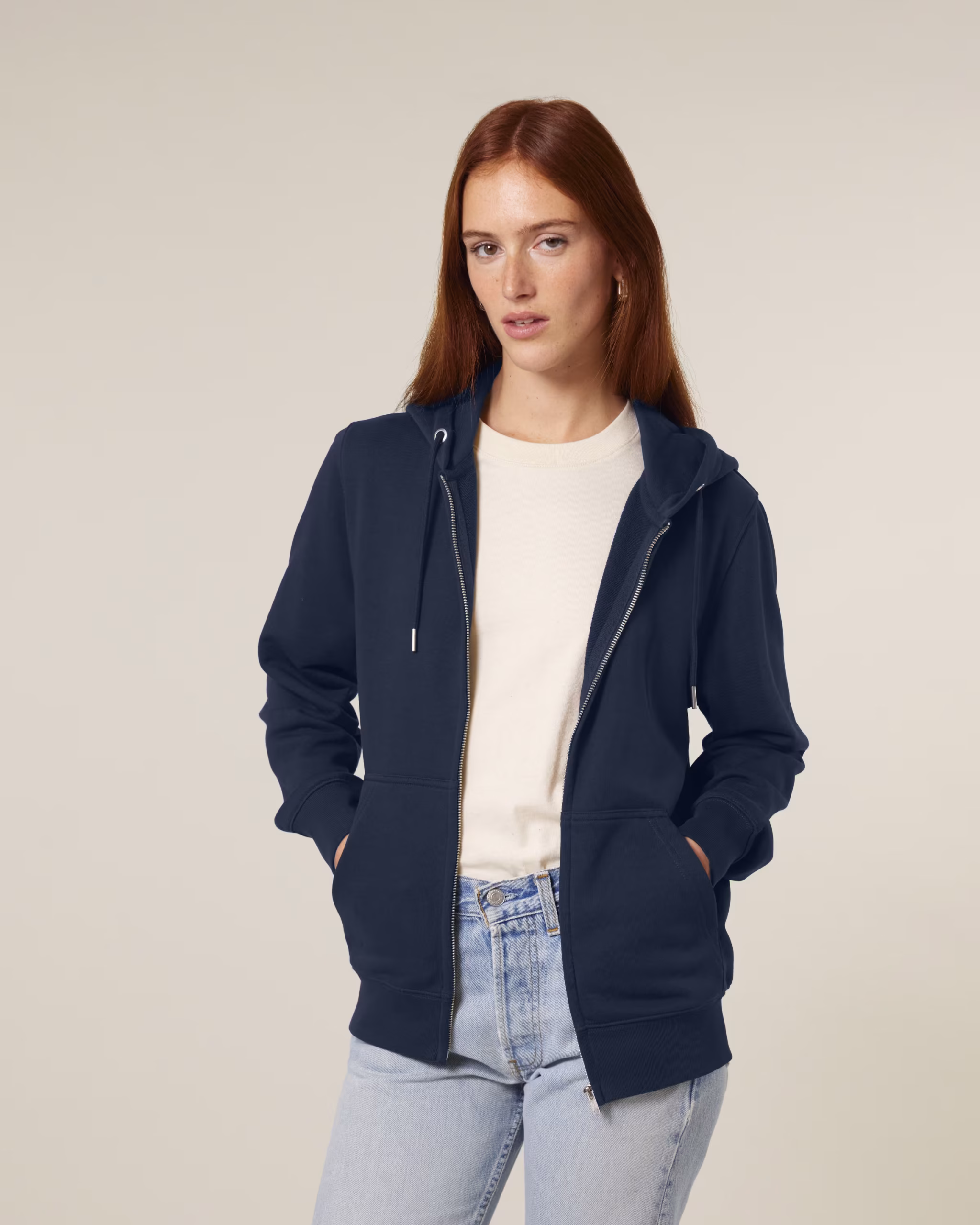 Full Zip met dubbelgelaagde capuchon, ton-sur-ton aantrekkoord met metalen uiteinden en bedekte metalen rits. Voorzien van visgraatband in de nek en langs de rits, ingezette mouwen en een kangoeroezak. Afgewerkt met 1×1-rib aan mouwen en zoom en duurzaam dubbel stiksel.