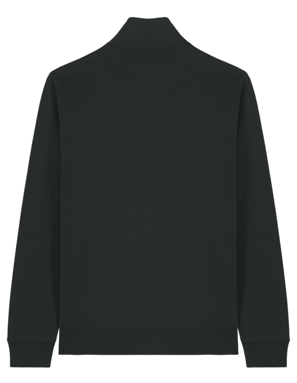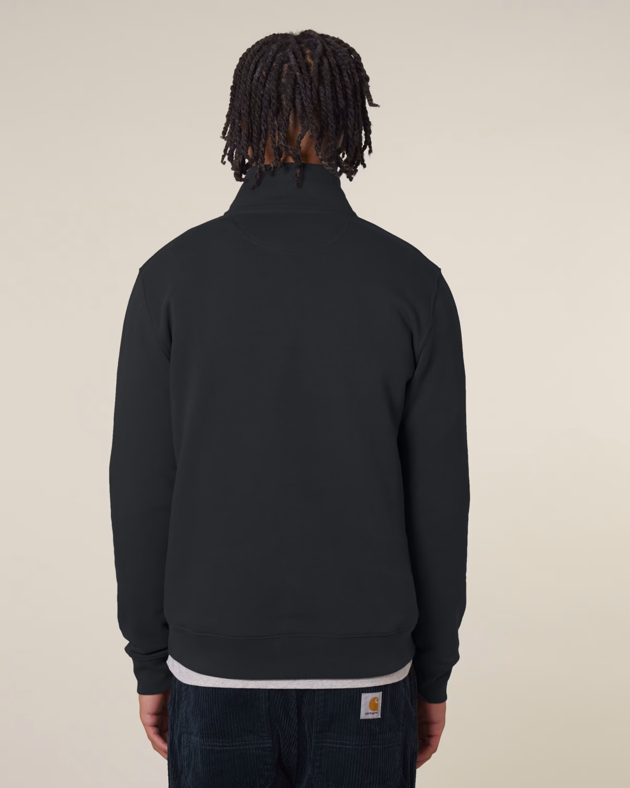 Deze trui heeft een opstaande kraag van eigen stof en een korte rits middenvoor, afgewerkt met visgraatband in de nek en langs de rits en een halve maan van eigen stof voor extra comfort. De ingezette mouwen en 1×1-rib aan mouwuiteinden en zoom zorgen voor een goede pasvorm, terwijl dubbel stiksel langs armsgaten, mouwuiteinden en zoom duurzaamheid garandeert.