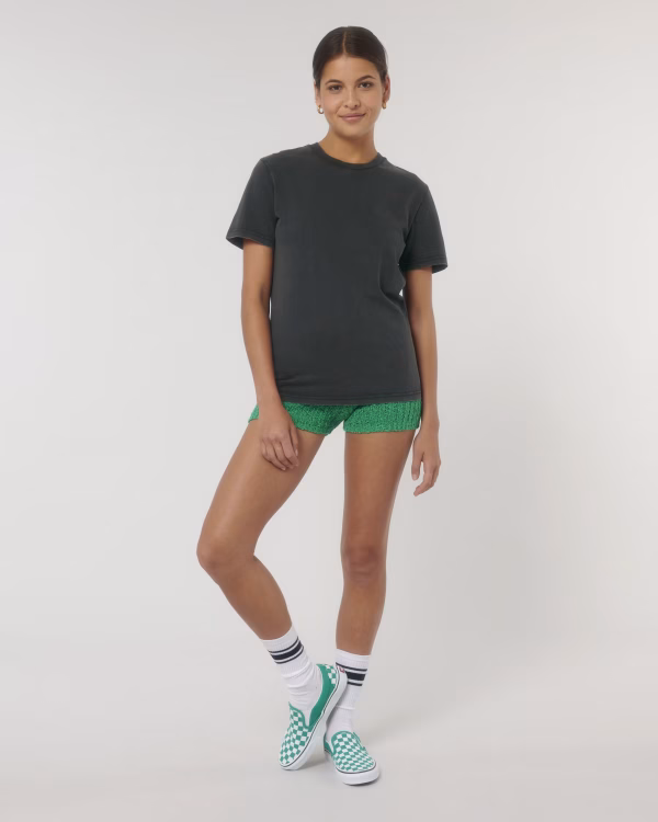 Unisex T-shirt met 1×1-rib halsboord, nektape van eigen stof en ingezette mouwen, afgewerkt met dubbel stiksel en vervaagde naden voor een karakteristieke washed look. Garment dyed, waardoor elk stuk uniek is en lichte kleurvariaties mogelijk zijn.
