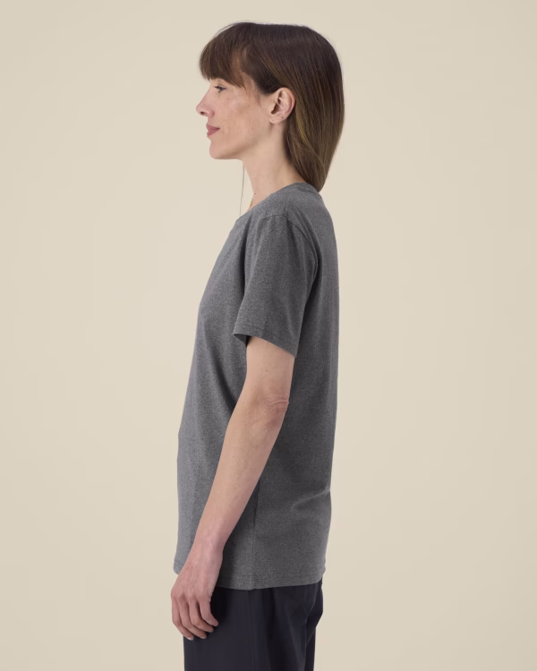 Unisex T-shirt van gerecycled katoen met een medium fit, afgewerkt met een 1×1-rib halsboord, nektape van eigen stof en ingezette mouwen. Het brede dubbele stiksel langs mouwuiteinden en zoom zorgt voor een stevige afwerking, terwijl het stofoppervlak een unieke ‘dry handfeel’ heeft dankzij gerecyclede vezels en eigen organisch snijafval.