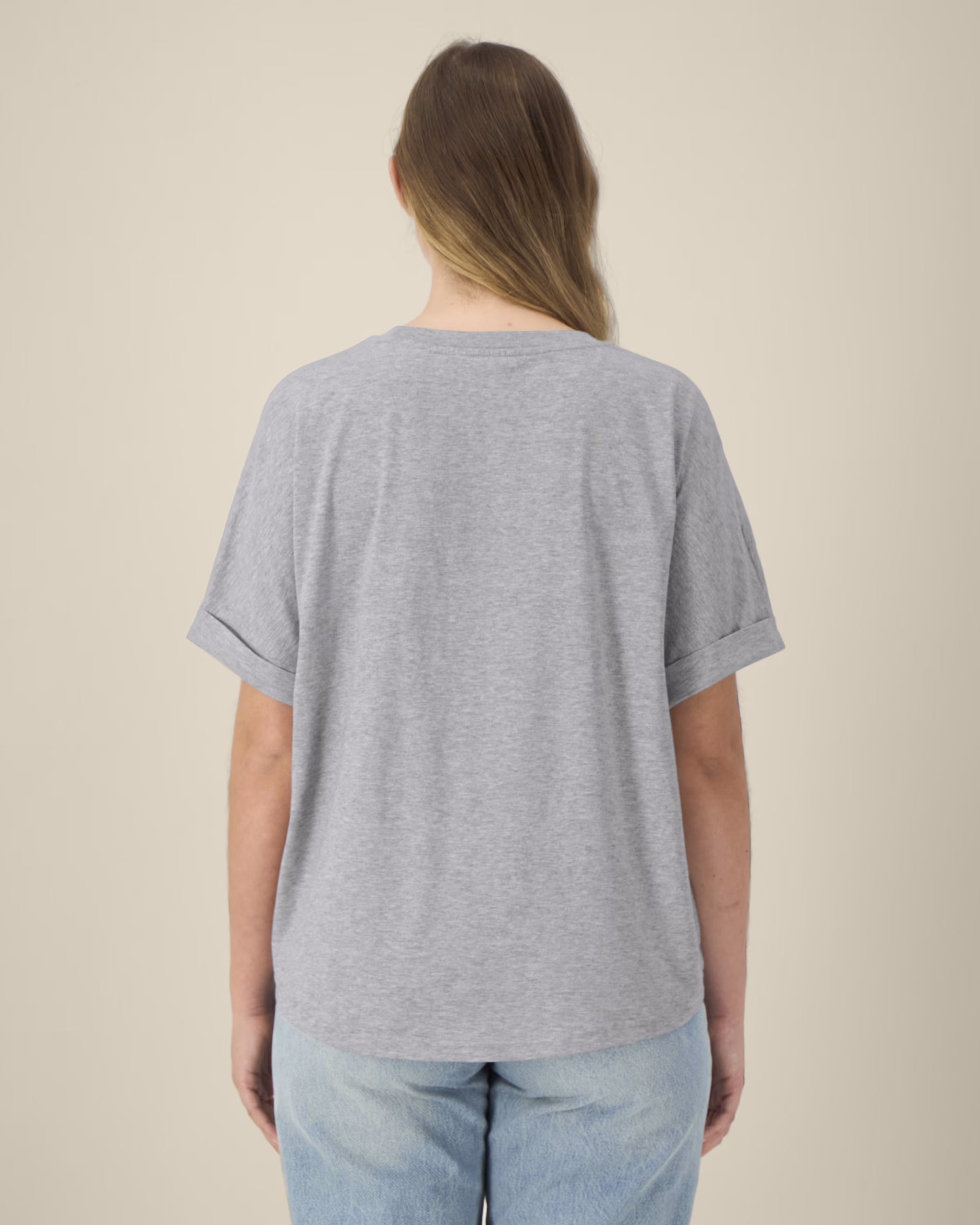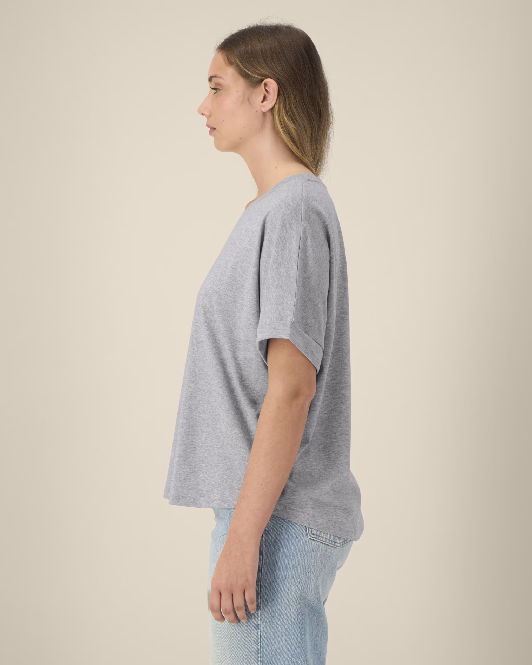 Dit shirt heeft een 1×1-rib halsboord en nektape van eigen stof voor extra comfort. De dolman-mouwen geven een losse, comfortabele pasvorm, terwijl de mouwuiteinden met trensjes zijn afgewerkt. De gebogen high-low zoom en het brede dubbele stiksel langs de zoom zorgen voor een stijlvolle en duurzame afwerking.