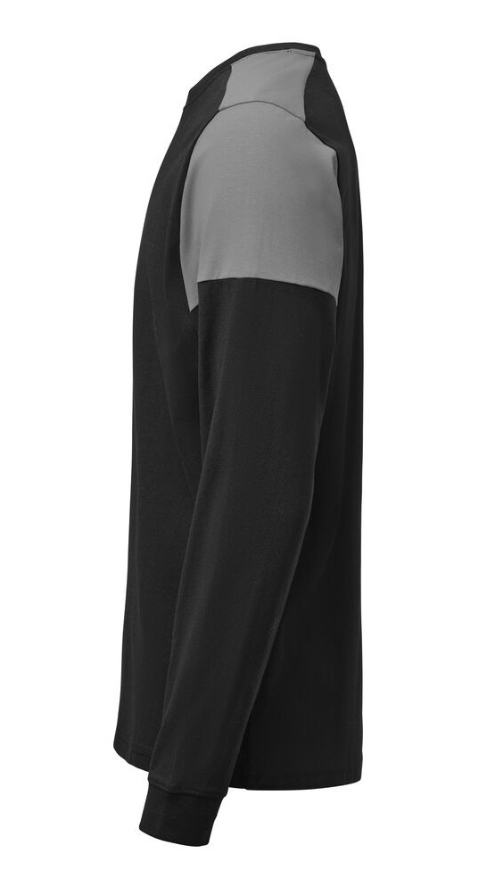 Moderne, bicolor T-shirt met lange mouwen. Rib met elastaan aan de hals en mouwen. Uitscheurbaar neklabel en afzonderlijk geweven maatlabel. Aan de binnenzijde van de linkerzijnaad werd een zakje voorzien voor het innaaien van een waschip. De stof is ringgesponnen en nabehandeld met een enzyme wash, waardoor het materiaal voorgekrompen is en zacht aanvoelt.